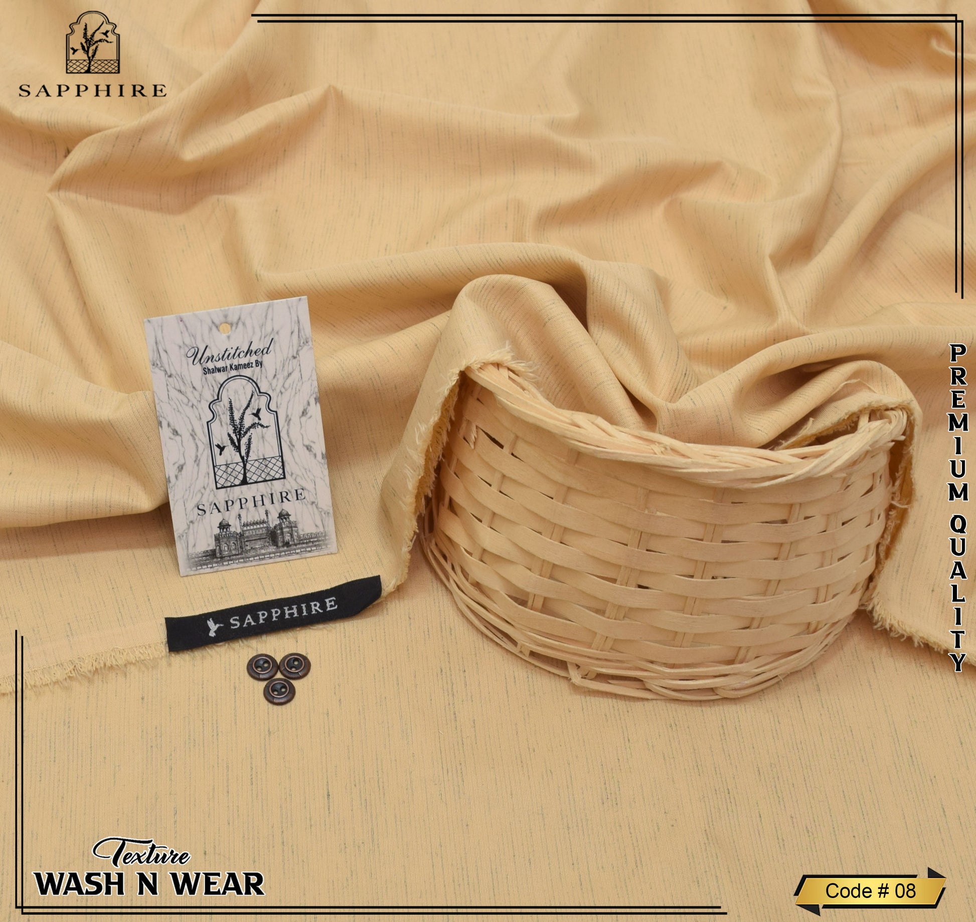 Sapphire Texture Wash & Wear offers premium fabric quality with an exceptional texture that requires minimal care. This fabric resists wrinkles and eliminates the need for frequent ironing, making it ideal for festive events. Experience unmatched ease and elegance with this sophisticated, low-maintenance attire.